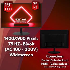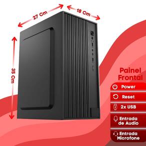 ESPECIFICAÇÕES TÉCNICAS: • Placa mãe: chipset H61; • Processador: Intel Core i3-2100 3.10GHz; • Memória RAM: 8GB DDR3; • Armazenamento: SSD 240GB Sata; • Sistema Operacional: Windows 10 Home Trial; • Fonte ATX: 200W (Bivolt, necessário seleção manual da voltagem); • Monitor: 19” LED com resolução máxima HD de 1440x900, possui entradas HDMI e VGA. Acompanha cabo HDMI.