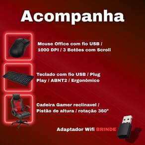 ITENS INCLUSOS: • Computador montado e pronto pra uso; • Cabo de energia para o computador; • Cadeira Gamer com pistão a gás e apoio ergonômico; • Monitor 19” com cabo HDMI; • Teclado com fio usb; • Mouse com fio usb;