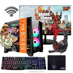 Processador Ryzen 3 3200G com gráficos integrados Radeon Vega 8.Placa-mãe A320.Memória RAM 8GB DDR4.SSD 240GB alta velocidade.Vídeo integrado Radeon Vega Graphics 8.Fonte 230W.Sistema operacional Windows 11 Pro Trial.Monitor 19.