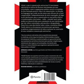 COMUNIQUE-SE EM TODOS OS LUGARES E COM TODAS AS PESSOAS Afinal, o que é comunicação antirracista? O movimento antirracista se utiliza de diversos instrumentos em suas articulações, como o engajamento político-social e as medidas de discriminação positiva. Mas é pela interlocução e pela filosofia da linguagem que se dá uma das maneiras mais eficazes de se fazer compreendido. Independentemente do meio empregado, do lugar ou do interlocutor, para a comunicação ser uma prática efetiva e transformadora, precisamos – todos – entender quais ações podem ser desenvolvidas para a de uma interlocução que não reforce estereótipos, preconceitos e desigualdades. Neste livro, uma obra basilar sobre o tema, a jornalista Midiã Noelle oferece as ferramentas necessárias para aprimorar as práticas comportamentais de todas as pessoas na construção de uma verdadeira comunicação antirracista. Marca: Não Informado