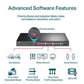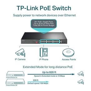 TP-Link Switch Fast Ethernet PoE de 24 portas 10/100Mbps 24 portas PoE+ @250W, com 2 portas Gigabit uplink + 2 compartimentos SFP combo modo de prioridade (TL-SL1226P), preto