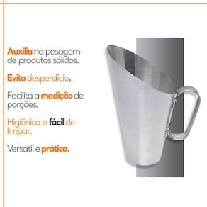 A Concha Medidora tem altura de 20,5cm e capacidade para 1 kg. Ela é feita de alumínio resistente, garantindo durabilidade e qualidade.