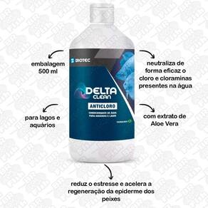 O DeltaClean é um produto formulado para uso em aquários e projetado para neutralizar de forma eficaz o cloro e cloraminas presentes na água. Apesar de serem comuns no sistema de tratamento de água potável, o cloro e as cloraminas podem ser prejudiciais para os peixes e outros organismos aquáticos. O DeltaClean é essencial para garantir que a água seja segura para todos os seres vivos do aquário. O DeltaClean também auxilia na remoção de metais pesados que podem estar presentes em concentrações mínimas na água de abastecimento. O DeltaClean contém extrato de Aloe Vera, que reduz o e acelera a regeneração da epiderme dos peixes, diminuindo riscos de inflamações. E prebiótico, para equilibrar a microbiota do aquário, estimular a microbiota intestinal dos animais e melhorar na conversão do alimento. EMBALAGEM: 500ml Marca: Delta Fish