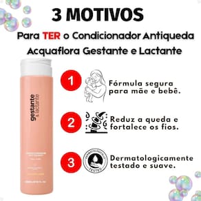 Condicionador Antiqueda Acquaflora Gestante e Lactante 250ml Descubra o Condicionador Antiqueda Acquaflora Gestante e Lactante 250ml, a solução ideal para mulheres que enfrentam a queda de cabelo durante a gravidez e a amamentação. Imagine cabelos mais fortes e saudáveis, sem a preocupação da queda excessiva. Enriquecido com uma fórmula suave e cientificamente comprovada, este condicionador desembaraça seus cabelos instantaneamente e age eficazmente na redução da queda, estimulando o crescimento de fios novos. Com ingredientes naturais como as Microalgas do Tahiti, o Extrato de Alecrim e os Aminoácidos, ele fortalece cada fio, proporcionando brilho e maciez, garantindo um cuidado completo e delicado para você e seu bebê. Ideal para quem busca beleza, segurança e bem-estar durante essa fase especial.