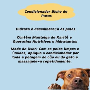 Condicionador bicho de patas - de karité e ojon Condicionador bicho de patas é desenvolvido com fórmula exclusiva. É um produto completo que reúne 5 resultados: alinhamento das cutículas, brilho, desembaraço, nutrição e hidratação profunda para os pelos dos pets. Contém um blend especial de de karitê e queratina. Composição: água, cloreto de cetiltrimetilamônio, álcool cetoesterálico, polyquaternium 7 , óleo de coco,queratina, óleo de , queratina, de karitê, fragrância e conservante. Modo de usar: com os pelos limpos e úmidos, aplique o condicionador por toda a pelagem do cão ou do gato e massageie-a repetidamente. Deixe agir por alguns minutos e enxágue bem. Precauções: uso externo. Mantenha em local seco, arejado e longe da luz solar. Mantenha fora do alcance de crianças, animais domésticos, longe de alimentos, medicamentos e produtos domésticos ou de higiene pessoal. Marca: Não Informado Ean: 7896006694342
