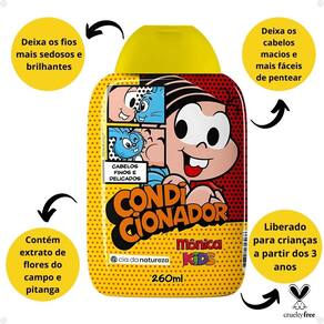 O Condicionador Cabelos Finos e Delicados Mônica contém extrato de flores do campo e pitanga e possui fórmula com ingredientes suaves que não irritam a pele ou o couro cabeludo. O condicionador ajuda desembaraçar com suavidade os cabelos, deixando-os macios, mais fáceis de pentear e com um delicioso cheirinho. Não irrita os olhos. Liberado para crianças a partir de 03 anos.