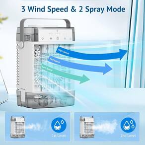 - ?3 velocidades do vento e 2 modos de névoa?Este ventilador de resfriamento evaporativo de 9 W tem 3 velocidades de vento, alta, média e baixa, e existem dois modos de pulverização que podem ser definidos, se você deseja esfriar rapidamente ou umidade suave, pode atender às suas necessidades, tornar sua vida de verão mais refrescante e agradável.
