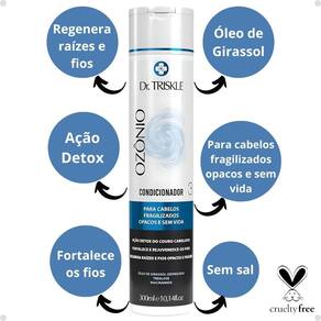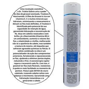 Uma revolução cosmética, a Dr Triskle Ozônio uniu o poder do óleo de girassol ozonizado, Trealose e Niacinamida. O Óleo de girassol é rico em vitamina E, C e muitos minerais que hidratam, minimizam o ressecamento e deixam os fios mais definidos. A Trealose é identificada pelo potencial de sua capacidade de retenção de água, garantindo hidratação e resconstrução do fio. Atua em cabelos ressecados e sem brilho. Já a Niacinamida (Vitamina B3) é um antioxidante, aumenta o volume dos fios, a elasticidade e o brilho, melhorando não só a aparência do cabelo, mas também a textura do mesmo, até daqueles que sofreram agressões químicas ou físicas. O ozônio combinado no óleo é um potencializador da ação ds componentes anteriores, fortalecendo e rejuvenescendo os fios, ajudando a eliminar pontas duplas, reduzindo o frizz. A ozonioterapia capilar repara e reconstrói cada fio. Com isso, é possível ter fios mais flexíveis, resistentes à quebra e mais facilidade no momento de pentear. Possui ação DETOX do couro cabeludo, trazendo cabelos soltos o balanço e movimento. Garantindo uma hidratação instantânea e regenerando o cabelo.