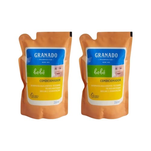 Condicionador granado bebê refil 250ml tradicional - kit com 2 unidades Descrição O condicionador granado bebê refil 250ml tradicional foi desenvolvido especialmente para os cuidados com os cabelos delicados dos bebês, oferecendo maciez, hidratação e desembaraço fácil. Sua fórmula suave é enriquecida com glicerina vegetal, proporcionando um cuidado nutritivo que respeita a sensibilidade do couro cabeludo infantil. Além de garantir fios sedosos e fáceis de pentear, o condicionador possui uma fragrância suave e clássica, que proporciona uma sensação de frescor e bem-estar após o banho. Com embalagem refil, o produto oferece uma opção mais econômica e sustentável, permitindo o reaproveitamento de embalagens anteriores. O condicionador granado bebê tradicional é dermatologicamente testado, hipoalergênico e livre de ingredientes agressivos, como corantes e parabenos, garantindo um uso seguro para a pele sensível dos pequenos. Ideal para o uso diário, ele cuida e protege os fios, deixando-os macios e cheios de vida. Modo de uso Após lavar os cabelos do bebê com shampoo, remova o excesso de água com as mãos. Aplique uma pequena quantidade do condicionador nas mãos. Distribua o produto de maneira uniforme pelos fios, evitando o contato direto com o couro cabeludo. Massageie suavemente, concentrando-se nas pontas, para facilitar o desembaraço. Enxágue bem com água morna, garantindo que todo o condicionador seja retirado, e seque com uma toalha macia.