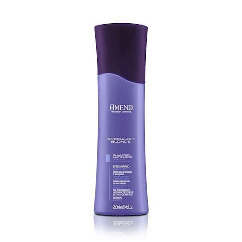 Shampoo matizador para cabelos loiros descoloridos e com mechas. Amend Specialist Blonde Shampoo Matizador neutraliza o tom amarelado ou alaranjado e revela um brilho platinado bonito.