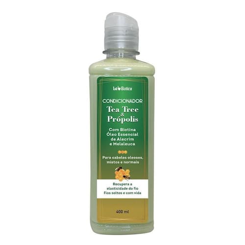Condicionador tea tree e própolis elasticidade e vida aos fios . Hidrata os fios, revitalizando o cabelo e o couro cabeludo. . Melhora a força e a elasticidade dos fios. . Com biotina e óleo de alecrim e . Extrato de própolis: Previne o desenvolvimento de micro-organismos relacionados à caspa e restaura a flora natural do couro cabeludo. Óleo essencial de : Remove impurezas do couro cabeludo. Ajuda a tratar caspas psoríase. Óleo essencial de alecrim: Estimula a circulação no couro cabeludo e promove limpeza no bulbo capilar, fortalece os fios e previne a queda. Biotina: Estimula o crescimento dos fios. Validade: 2 anos. Devido a alta rotatividade dos produtos, o ano vigente normalmente é o ano de envase. Não testado em animais. Direto de fábrica.