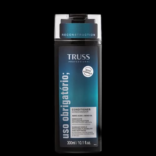 Condicionador para cabelos quebradiços, desidratados e com química. TRUSS Uso Obrigatório Reconstruction um tratamento altamente condicionante reconstrutor, com blindagem contra danos, ação antifrizz e antiquebra.