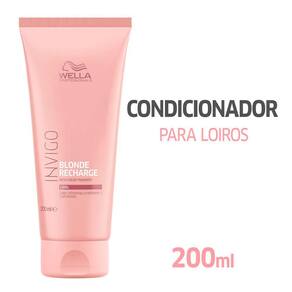 O Condicionador Wella Professionals Cool Blond Recharge Invigo é indicado para cabelos loiros coloridos, naturais ou com mechas. Elimina os tons amarelados e acobreados indesejados com seus pigmentos violeta, além de desembaraçar dos fios de forma suave. Além disso, mantém a cor bonita, com muito brilho, fios suave ao toque e fragrância floral delicada, com lírio do vale, rosas, sândalo e baunilha. Confere fios hidratados por muito mais tempo. Benefícios: - Neutraliza tons amarelados e acobreados; - Hidrata intensamente; - Brilho luminoso. Resultado: Seu cabelo fica desembaraçado, com um loiro mais bonito, iluminado e livre dos tons amarelados e acobreados. Modo de usar: Aplique o condicionador sobre o cabelo limpo e úmido, pelo comprimento e pontas. Depois de alguns instantes, enxágue.