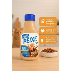 Condimento Para Ração De Gatos Tasty Peixe 250g Molho Tasty Sabor Peixe Para Gatos 250g O Molho Tasty sabor peixe foi desenvolvido especialmente para gatos, trazendo mais sabor e atratividade à ração seca. É a solução ideal para tutores que desejam aumentar a palatabilidade dos alimentos, garantindo que os gatos se alimentem melhor e com mais prazer. Benefícios do produto: