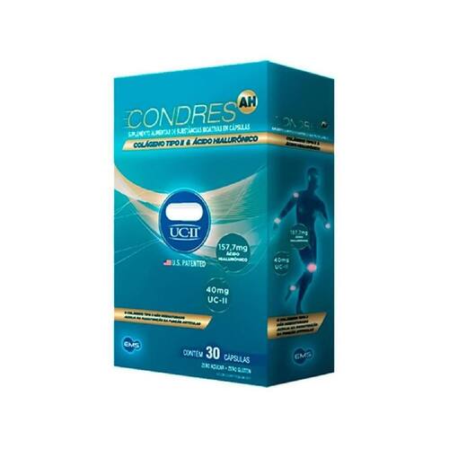 Condres AH 30 Cápsulas Gender UNISEX Condres AH é um suplemento alimentar de substâncias bioativas em cápsulas, a base de colágeno tipo II e ácido hialurônico que auxiliam na manutenção da função articular. Recomenda-se tomar 1 cápsula uma vez ao dia, ou conforme orientação do médico e/ou nutricionista. Marca: Condres Ean: 7894916515672