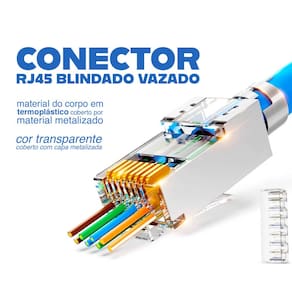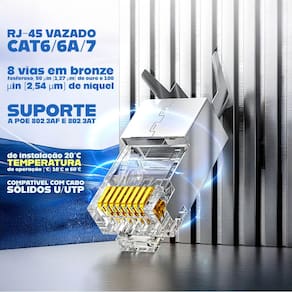 O Conector RJ45 Blindado Vazado é desenvolvido para instalações profissionais que exigem alta performance, precisão e estabilidade em redes de alta velocidade. Seu corpo em termoplástico com capa metalizada reduz interferências externas, enquanto o design vazado permite a visualização dos fios, facilitando a montagem e evitando erros de crimpagem. Compatível com cabos sólidos U/UTP 22–24 AWG, oferece excelente condução graças aos contatos em bronze fosforoso com banho de ouro e níquel. Suporta POE 802.3af/at e apresenta alta resistência para instalação interna. Acompanha suporte organizador de fios, garantindo alinhamento perfeito, maior agilidade e produtividade no processo de montagem.
