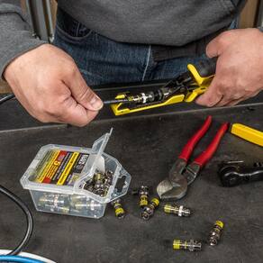 Klein Tools VDV813-613 Conector BNC para cabos coaxiais RG6/6Q, conectores de compressão universais, macho, pacote com 35 - A tecnologia patenteada de manga universal é instalada até 5 vezes mais rápido do que outros conectores de compressão - As janelas de visualização patenteadas na manga ajudam no assento adequado - Serve para a maioria das principais marcas de cabos de proteção quádrupla RG6/RG6Q - Compatível com cabos multiescudo e plenum - Estrutura de latão sólido com revestimento de níquel escuro para uso interno - Também disponível em um pacote de 10 gatos. Não. VDV813-607)