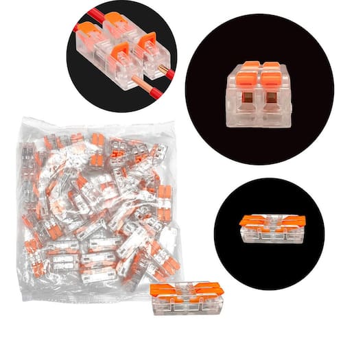 Modelo: Conector Flat 2 Vias Tipo: Emenda linear de conexão rápida Fixação: Manual, sem uso de ferramentas Aplicação: Instalações elétricas de baixa tensão Material: Polímero isolante com contatos metálicos condutivos Compatibilidade: Condutores rígidos e flexíveis Condutores suportados: 0,5–2,5 mm² Tensão máxima: 250 V Corrente máxima: 32 A Quantidade: 50 unidades