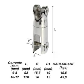 Em aço inox, com pino destorcedor reforçado, abertura para corrente de 10 a 12mm.