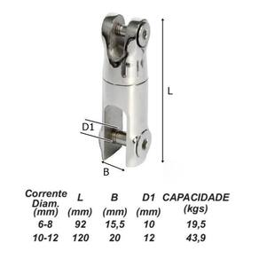 Em aço inox, com pino destorcedor reforçado, abertura para corrente de 10 a 12mm. Utilizado para junção da corrente galvanizada ou inox em âncora de todos os modelos. Modelo universal, utilizado para tirar a tensão dos cabos e correntes