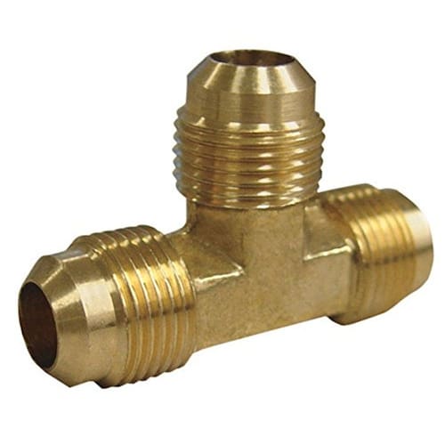 Conector en T de latón amarillo JMF con diámetro de 5/16 pulgadas, diseño flare a flare para conexiones seguras y resistentes.