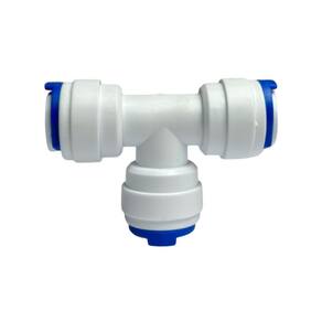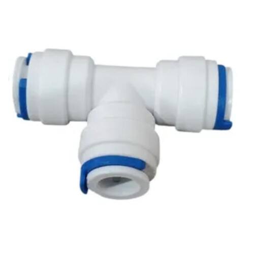 Conector tipo T para mangueira de 5/16 polegadas, compatível com geladeiras, purificadores e bebedouros Brastemp, Consul e Electrolux. Fabricado em plástico técnico de alta resistência com engate rápido e vedação em borracha.Tipo
