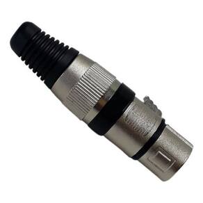 Conector XLR Femea de linha, 3 pinos, metal, capa plástica de alta resistência e prensa cabo. Possu Em prensa cabo.
