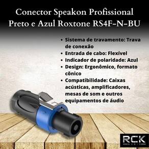 O Conector Speakon Profissional Preto e Azul Roxtone RS4F-N-BU é um tipo de conector utilizado em cabos de áudio profissionais, especialmente em sistemas de som de grande porte, como caixas acústicas e amplificadores.