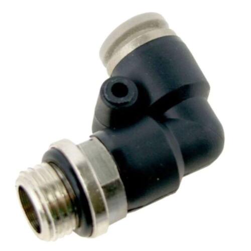 Conexão cotovelo macho giratório. São rápidas para aplicação pneumática, água e de vácuo. São indicadas para temperaturas até 60ºC e pressão máxima de 10 bar. Recomendado para rosca de 1/4" para tubos de diâmetro de 8mm. Fabricado em latão niquelado para maior durabilidade.