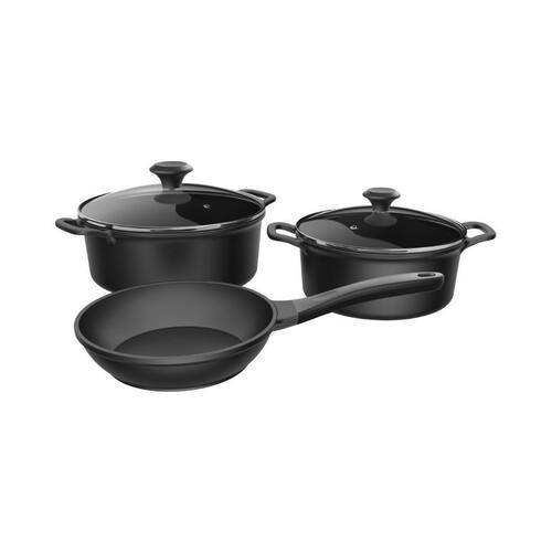 1 Frigideira - Tamanho 20cm; 1 Caçarola - Tamanho 20cm; 1 Caçarola - Tamanho 24cm; 1 Tampa de Vidro - Tamanho 20cm; 1 Tampa de Vidro - Tamanho 24cm; 1 Manual.