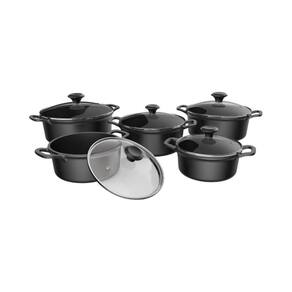 1 Caçarola - Tamanho 16cm; 1 Caçarola - Tamanho 18cm; 1 Caçarola - Tamanho 20cm; 1 Caçarola - Tamanho 22cm; 1 Caçarola - Tamanho 24cm; 1 Tampa de Vidro - Tamanho 16cm; 1 Tampa de Vidro - Tamanho 18cm; 1 Tampa de Vidro - Tamanho 20cm; 1 Tampa de Vidro - Tamanho 22cm; 1 Tampa de Vidro - Tamanho 24cm; 1 Manual.