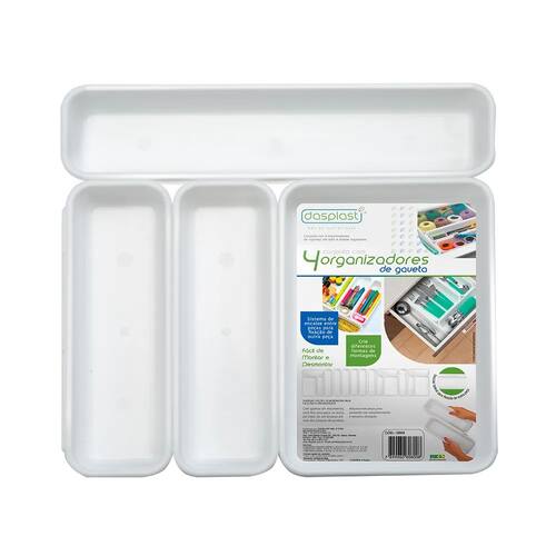O Conjunto com 4 Organizadores DasPlast é perfeito para manter armários, gavetas e prateleiras sempre em ordem. Fabricados em plástico resistente e de alta durabilidade, os organizadores possuem acabamento liso e bordas reforçadas, ideais para armazenar alimentos, produtos de limpeza, cosméticos ou pequenos objetos.