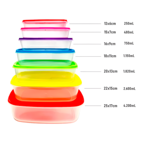 CARACTERÍSTICAS PRINCIPAIS:- Ideais para organizar e armazenar seus alimentos de maneira prática e segura.- Peças encaixáveis.- Economia de espaço e praticidade na cozinha.- Pode ser utilizado em geladeira, freezer, micro-ondas e lava louça.- Material: Plástico.- Capacidade: 4.200ml, 2.600ml, 1.820ml, 1.150ml, 750ml,480ml, 250ml.- Tamanho: 25cm x 17cm, 22cm x 15cm, 20cm x 13cm, 18cm x 11cm, 16cm x 9cm, 15cm x 7cm, 13cm x 6cm.- Peso Total do Kit: 530g.TEMOS SEU PRODUTO EM ESTOQUE ENVIAMOS SEU PEDIDO EM ATÉ 1 DIA ÚTILAPÓS A CONFIRMAÇÃO DO PAGAMENTO.