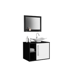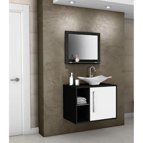 A Móveis Bechara trás produções com alto nível de qualidade. Com uma linha de produtos moderna e inovadora. O Conjunto para Banheiro Baden é perfeito para o seu banheiro. O kit é composto por espelheira e gabinete com cuba de apoio em mármore sintético. Produzido em MDP, com secagem UV e impressão a laser. Tem acabamento com pintura da superfície em verniz poliéster brilhante. O acabamento das bordas é com fita de papel decorativo aplicado mecanicamente por sistema hot melting. Conta com 1 prateleira de vidro na parte superior da espelheira e 2 no gabinete, sendo 1 de vidro e 1 prateleira interna em MDP. Puxador de plástico com acabamento cromado e dobradiças metálicas.