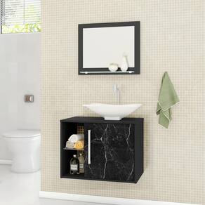 A Móveis Bechara trás produções com alto nível de qualidade. Com uma linha de produtos moderna e inovadora. O Conjunto para Banheiro Baden é perfeito para o seu banheiro. O kit é composto por espelheira e gabinete com cuba de apoio em mármore sintético. Produzido em MDP, com secagem UV e impressão a laser. Tem acabamento com pintura da superfície em verniz poliéster brilhante. O acabamento das bordas é com fita de papel decorativo aplicado mecanicamente por sistema hot melting. Conta com 1 prateleira de vidro na parte superior da espelheira e 2 no gabinete, sendo 1 de vidro e 1 prateleira interna em MDP. Puxador de plástico com acabamento cromado e dobradiças metálicas.