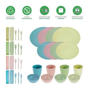 Aparelho de jantar ecológico multicolorido com peças nas cores: laranja, amarelo, azul e verde. Produzido em PP com fibra de trigo, é extremamente resistente inquebrável , pode ser levado ao micro-ondas, freezer e máquina de lavar louças. É 100% reciclável e livre de BPA, fácil de limpar e não risca.