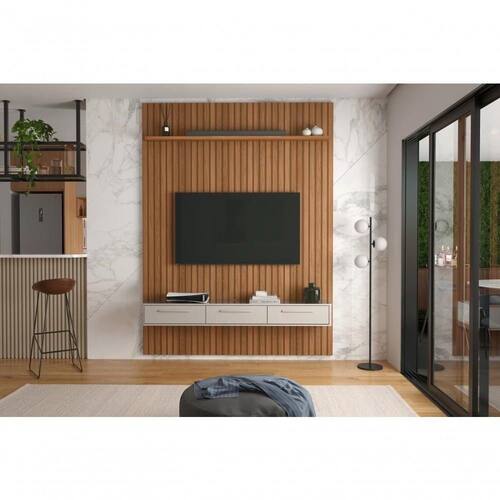 Altura da prateleira opcional Itens Incluso: Conj. Painel Frisado Oslo Jequitiba + Bancada Bali 1.9 Off White, kit de montagem e manual de instrução
