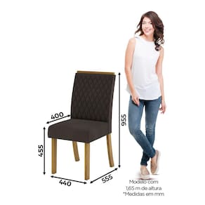 A cadeira Rita possui detalhes únicos que deixam a peça com ar de sofisticado e ao mesmo tempo transparece modernidade. Com pés em MDF de 25mm, sendo que a fixação é feita com peças de metal, que garantem maior segurança e durabilidade ao móvel. Possui moldura para pega no encosto, evitando assim o contato direto das mãos com o tecido. Possui medidas de 950 mm de altura, 440 mm de largura e profundidade de 575mm. O encosto é inclinado reto, estofado do assento com espuma de 30mm e densidade de 23, com tecido Suede bordado, proporcionando maior conforto para aquele descanso merecido e para os momentos tão especial de reunir a família