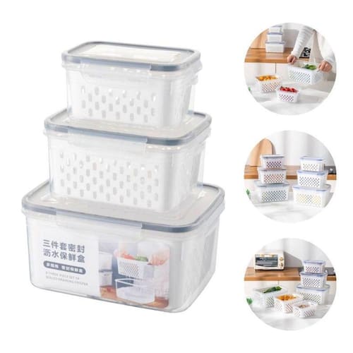 Conjunto 03 Potes Herméticos Empilhável Com Cesto Interno Conjunto 03 Potes Herméticos Empilhável Com Cesto Interno ===================================== Cada pote acompanha um cesto interno removível, que facilita a drenagem de líquidos e a separação de alimentos, sendo especialmente útil para frutas, legumes lavados ou itens que precisam de ventilação. Produzidos em plástico transparente resistente, os potes permitem fácil visualização do conteúdo, além de possuírem tampa com vedação hermética, que protege os alimentos contra umidade, odores e contaminações. Versáteis e duráveis, os potes são ideais para uso doméstico ou , atendendo diferentes necessidades de armazenamento com eficiência e estilo. ===================================== Contém: 03 Potes Especificações: - Material: Plástico e Silicone - Medida Pote 01: 22cm x 16,5cm x 10,5cm / 3,3 Litros - Medida Pote 02: 18cm x 13,5cm x 09cm / 1,75 Litros - Medida Pote 03: 15cm x 10cm x 07cm / 850ml - Livre de BPA - Hermético - Empilhável: Sim - Cesto Interno Removível - Tampa com Travas nas Laterais - Cor da vedação de silicone enviada de forma aleatória ===================================== Devido à diferença entre monitores e iluminação diferentes, pode haver variação na tonalidade apresentada no anúncio. Medidas muito aproximadas. Marca: Não Informado Ean: 6013400057509