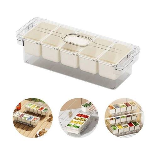A estrutura firme e o fechamento eficiente tornam esse conjunto uma solução versátil também para organização de itens não alimentares, como materiais de artesanato ou escritório. ===================================== Contém: 05 Potes 01 Caixa com Tampa 05 Colheres 01 Pegador