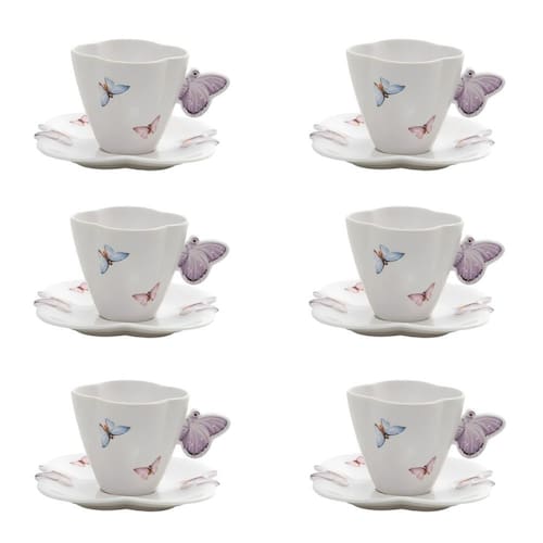 As 6 xícaras de café acompanham pires em porcelana branca com estampa delicada de borboletas, trazendo um toque romântico e sofisticado para a mesa. Com 100 ml, são perfeitas para servir café no dia a dia ou em ocasiões especiais.