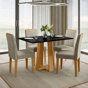 Renove sua sala de jantar com o Conjunto Rubi, a união perfeita entre design moderno e durabilidade. Este conjunto exclusivo apresenta um tampo preto em MDF de 1,8cm com vidro sobreposto de 0,3cm, garantindo brilho sofisticado e praticidade na limpeza. Para o máximo conforto, acompanha 4 cadeiras Amanda estofadas. Tudo isso estruturado em uma base robusta na cor Ypê, que une o charme do acabamento amadeirado à leveza do design contemporâneo. O destaque que sua casa merece!
