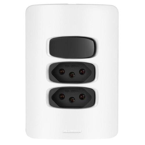 Alumbra Gracia - Placa Branca / Módulos Pretos / Interruptores e Tomadas Conjunto Completo Desmontado com: 1 Módulo de Interruptor Simples 2 Módulos de Tomadas 10A 1 Placa para 2 módulos 4X2 1 Suporte 4X2 2 Parafusos Para montar é apenas um click, apenas encaixar