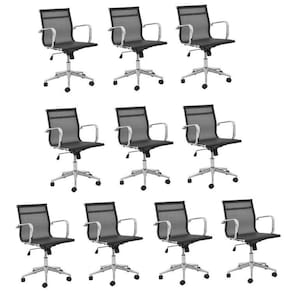 Conjunto com 10 cadeiras de escritório com estrutura em aço, revestimento em tela mesh, com encosto baixo. Possui base giratória em aço cromado e rodízios em nylon. Possui ajuste de altura (mínimo 89cm e máximo 98cm) e sistema relax. Altura do Conjunto: 89 cm Ambiente: null Ambiente Principal: Escritório Cor: Preto Informação Complementar: 2x Conjunto 4 Cadeiras de Escritório com Rodízios Office Sevilha Móveis Preto Largura: 55 cm Altura: 89 cm Peso: 8,75 kg Profundidade: 59,5 cm Necessita Montagem: Sim