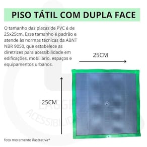 As placas de piso tátil são fabricadas em PVC, um material plástico durável e resistente ao desgaste. Cada placa segue as normas técnicas da ABNT NBR 9050 para acessibilidade em edificações e espaços públicos.