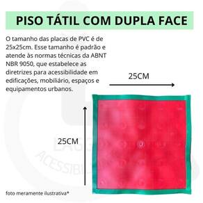 Cada placa tem dimensões padronizadas de 25x25cm, seguindo as normas técnicas da ABNT NBR 9050 para acessibilidade em edificações e espaços públicos. A instalação é simplificada, basta remover a película protetora e fixar as placas no chão. Antes da instalação, é importante preparar a superfície do piso para garantir uma aderência adequada.