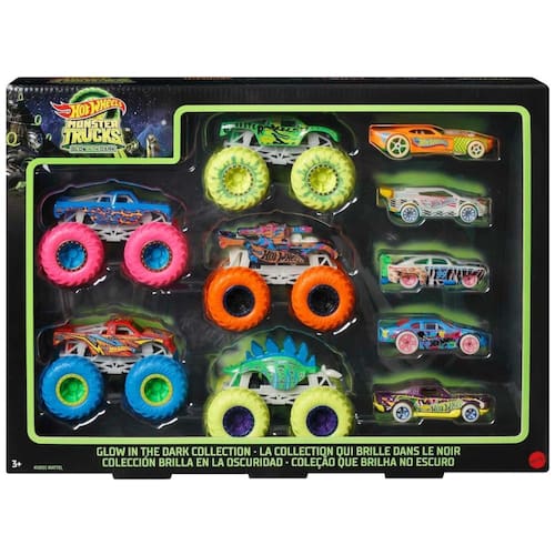 Este conjunto de Monster Trucks Hot Wheels Glow in the Dark contém 10 veículos, sendo 5 Monster Trucks e 5 carros em escala 164. Com elementos Glow in the Dark, a brincadeira fica ainda mais emocionante, proporcionando jogos intermináveis de quebra e colisão com as luzes acesas ou apagadas. As crianças podem colecionar outros veículos e brinquedos Monster Trucks para ainda mais brincadeiras de acrobacias, corridas e batalhas.