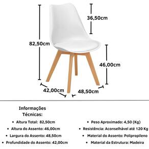 Tonalidade: Branco | Altura: 82,50 | Produto: Cadeira de Jantar Leda | Largura: 48,50 | Material da Estrutura: Madeira | Cor: Branco | Peso do Produto: 4,50 | Fabricante: Magazine Decor | Cômodo Indicado: Cozinhas | Acompanha Braço: Não | list_price: ,99 | Necessita Montagem: Sim | batteries_required: Não | included_components: 12 Cadeiras | is_fragile: Não | part_number: 1 | number_of_boxes: 2 | model_number: 1 | item_package_weight: 50 | bullet_point#0: A Cadeira de Jantar Eames Wood Leda vai dar um up na decoração do seu lar! Feitas em material de excelente qualidade, as cadeiras Eames Wood Leda Design são uma ótima escolha para fazer parte de cômodos como sala de jantar, área de recreação e lazer, entre outros locais | bullet_point#1: Apresentadas em , elas podem ser inseridas na decoração de diferentes estilos. As cadeiras Eames Wood Leda Design são ideais para quem está em busca de conforto e um design diferenciado. | bullet_point#2: Um diferencial importante destas cadeiras é que elas possuem uma base de madeira, este material confere mais resistência à cadeira e é um toque de estilo a mais no modelo. Vale a pena apostar nesta cadeira, a versatilidade permite que ele seja colocado em diversos espaços da casa. | number_of_items: 12 | Coleção Jardim: Não | Selecione: Cadeira de Jantar Leda | O Produto pode Expirar: Não | Certificação de teste externa: Não | Dimensões do item P x L x A: 82,50x48,50x42 | Certificado de Conformidade do Produto: Não
