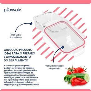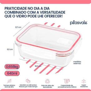 Praticidade no dia a dia combinado com a versatilidade que o vidro pode lhe oferecer Chegou o produto ideal para o preparo e armazenamento do seu alimento. Com a tampa, esses potes podem ser levados ao freezer e geladeira, tem vedação hermética que auxilia na conservação de qualquer alimento que necessite de refrigeração e as travas indicam ser o produto perfeito para aquela refeição fora de casa, pois traz segurança e que não vaza. O corpo, de vidro borossilicato, desde que sem a tampa, possibilita o preparo de alimentos no forno ou microondas, pois é resistente à altas temperaturas. Não perca a oportunidade e adquira o Pote de vidro hermético da Plasvale agora mesmo Dimensões: 18,0x 13,7 x 6,0cm Comprimento x Largura x Altura Peso: 0,658 Kg Capacidade: 640 ml Corpo resistente à temperaturas entre -20 à 400ºC Recomendações de Uso: - Adequado para Microondas Sem a Tampa . - Permitido para Máquina de Lavar Sem a Tampa - Apropriado para Forno Sem a Tampa - Permitido para Freezer e Geladeira. Dicas Loja do Café: Lave antes do primeiro uso e não utilize produtos abrasivos. Lavar sempre com esponja macia e detergente neutro. Marca: Não Informado