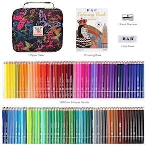 Este conjunto H & B oferece 180 lápis de cor com minas à base de óleo, acompanhados de borracha, apontador e livro para colorir, indicado para uso a partir de 14 anos em desenho e coloração. As minas são formuladas para equilíbrio entre maciez e firmeza, proporcionando traço suave e boa resistência à quebra.